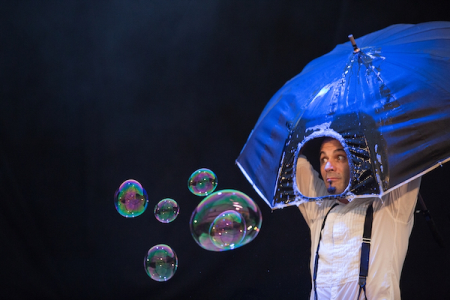 Piove, la finestra è aperta e in casa ci vuole l’ombrello. Che strano questo omino tutto inzuppato: fa uno starnuto ed esce una bolla di sapone. Anzi due. Anzi moltissime bolle di sapone. Ma cosa succede? La casa si riempie di bolle di tutte le dimensioni, minuscole e giganti, schiumose e trasparenti come cristallo. Intanto la pioggia non smette di cadere. E tra poco scenderà pure la neve. Ecciù! Uno spettacolo comico e magico, un viaggio onirico e visuale accompagnato dalla magia delle piccole cose e da spettacolari effetti con acqua e sapone.